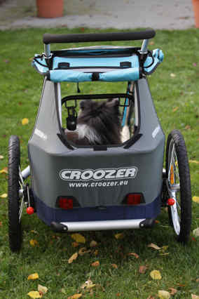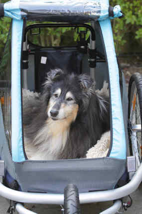 Man kann weite Wege laufen wie gewohnt und transportiert den alten Collie in einem Wagen.