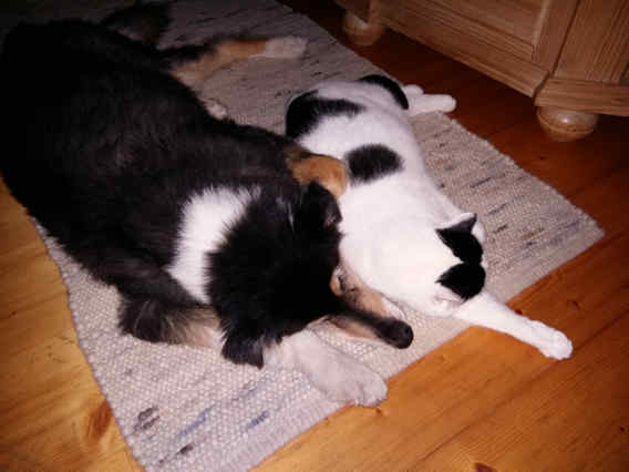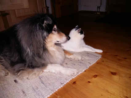 Ich bin ein lieber Collie, verträglich mit allen Hunden und Katzen mag ich auch.